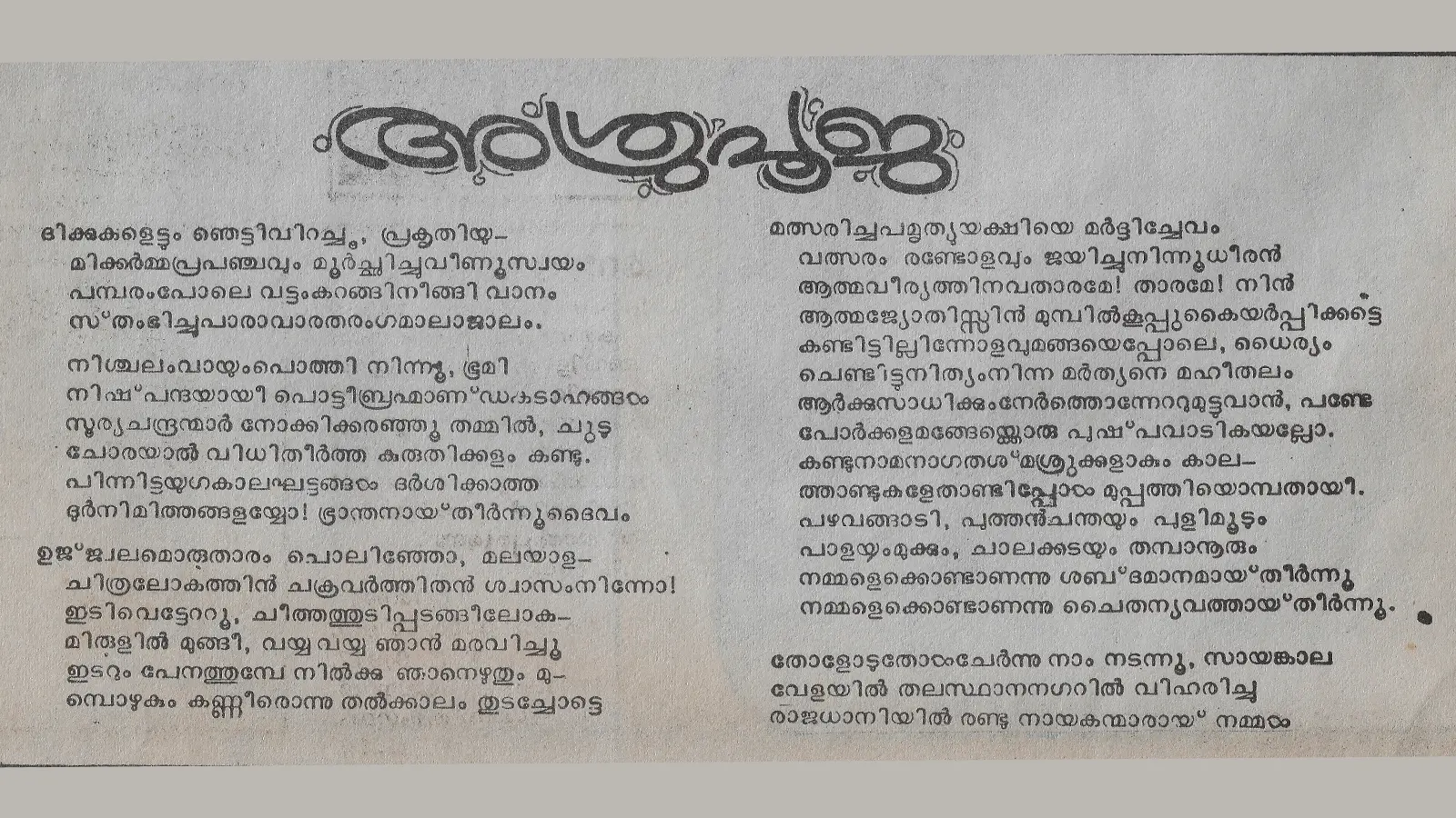 അതുകഴിഞ്ഞ് ഞാൻ നേരേ എന്റെ വീട്ടിൽ വന്നു. ധാരധാരയായി ഒഴുകിയ കണ്ണുനീരിനെ തുടച്ചു തുടച്ചുമാറ്റിക്കൊണ്ട് ഞാനൊരു കവിതയെഴുതി. “അശ്രുപൂജ”.